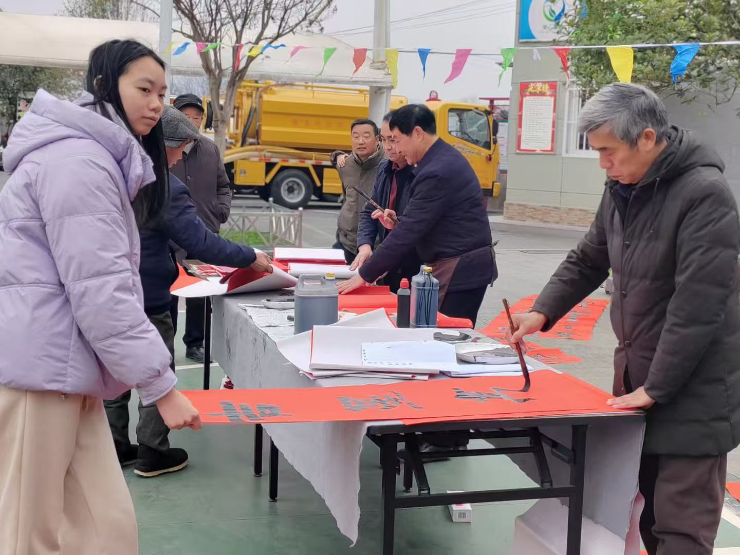 “村晚”現(xiàn)場還設(shè)置了新春惠民服務(wù)區(qū),成為一道溫暖的風(fēng)景線。鎮(zhèn)文化站邀請本土?xí)椰F(xiàn)場揮毫潑墨,免費(fèi)為村民書寫春聯(lián)和福字,墨香四溢,紅紙映春,村民們有序排隊領(lǐng)取,把新春祝福帶回家。鄉(xiāng)村年貨展銷區(qū)人氣高漲,漢陰富硒糧油、土蜂蜜、臘肉、豆腐干等特色農(nóng)產(chǎn)品整齊擺放,駐村第一書記、村“兩委”干部化身“推銷員”,熱情推介本土好物,既方便村民置辦年貨,又拓寬農(nóng)產(chǎn)品銷售渠道,讓“村晚”既有文化味,更有煙火氣與增收實效。