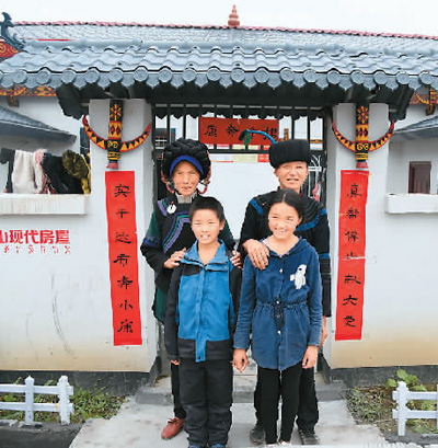 | 東西部扶貧協作推動區域協調發展。圖為6月19日四川涼山州申果鄉達布村貧困戶阿牛爾鐵一家在易地搬遷后的新居前合影。 |