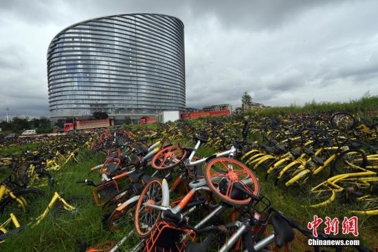 9月9日,現場堆積如山的共享單車。近半年來,位于昆明市盤龍區的閑置荒地里堆放了大量的共享單車,數量已超萬輛。中新社記者 李進紅 攝