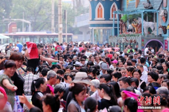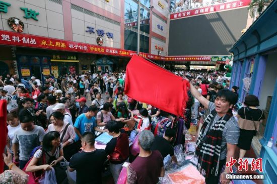 9月15日,商戶(hù)在北京天意商城甩賣(mài)商品,吸引大批顧客搶購(gòu)。天意商城是北京規(guī)模最大的小商品批發(fā)兼零售市場(chǎng),為疏解北京非首都功能,天意商城將于9月16日關(guān)門(mén)停業(yè)。中新社記者 盛佳鵬 攝