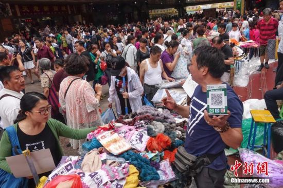 9月15日,天意商戶(hù)舉起二維碼方便顧客掃碼支付,以新式支付方式助力傳統(tǒng)零售。當(dāng)日,自1992年開(kāi)業(yè)至今的北京天意市場(chǎng)迎來(lái)其在北京西城阜外大街營(yíng)業(yè)的最后一日,商家趁機(jī)“瘋狂甩貨”,大批北京民眾也紛至沓來(lái)。這里曾是北京著名的小商品商城,聚集了數(shù)千家商戶(hù)。為疏解北京非首都功能,天意商城將于本月16日關(guān)門(mén)停業(yè)。中新社記者 崔楠 攝