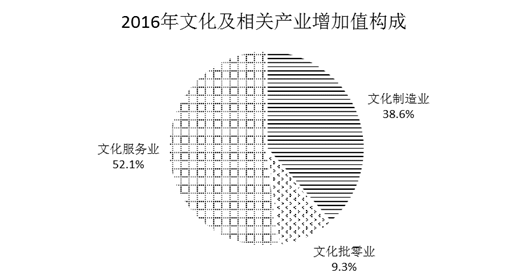 按行業(yè)分,2016年文化制造業(yè)增加值為11889億元,比上年增長(zhǎng)7.6%,占文化及相關(guān)產(chǎn)業(yè)增加值的比重為38.6%;文化批發(fā)零售業(yè)增加值為2872億元,增長(zhǎng)13.0%,占9.3%;文化服務(wù)業(yè)增加值為16024億元,增長(zhǎng)17.5%,占52.1%。