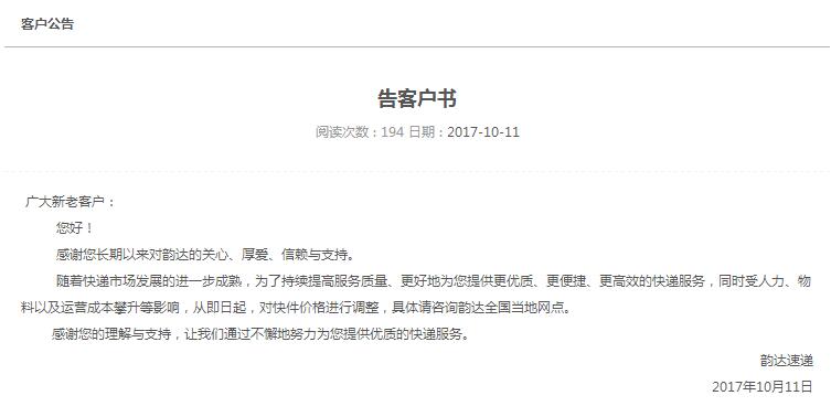 10月11日,韻達(dá)快遞官網(wǎng)發(fā)布《告客戶書》,表示為提供更優(yōu)質(zhì)、更便捷、更高效的快遞服務(wù),同時(shí)受人力、物料以及運(yùn)營(yíng)成本攀升等影響,從即日起,對(duì)快件價(jià)格進(jìn)行調(diào)整,具體請(qǐng)咨詢韻達(dá)全國(guó)當(dāng)?shù)鼐W(wǎng)點(diǎn)。