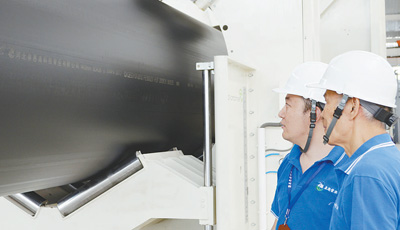 | 泉恩管業(yè)工作人員正在查看大口徑PE生產(chǎn)線(xiàn)激光噴碼作業(yè)。 |