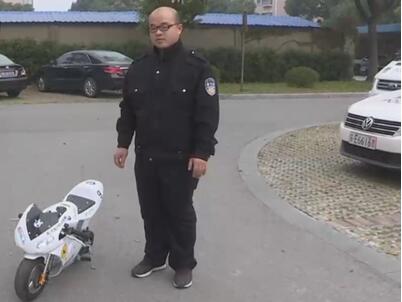 這輛白黑相間,同時有著寶馬和保時捷標志的車輛,就是民警剛剛被查獲的迷你摩托車。油箱、油門、剎車一樣也不少,只是這個頭,相比旁邊的警摩來說足足小了三四圈。這是11月2號下午兩點,警察在吳江云龍路上查處的車輛。監控上可以看到駕駛員被查后,用一個手抬起后輪,就輕松推走了這輛車。