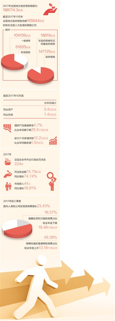 防風險大幕開啟于2017年。這一年,監管部門專項整治市場亂象,彌補制度短板,引導金融機構回歸本源,專注主業,增強服務實體經濟能力。2018年金融防風險將在哪些重點領域出手?投資者和企業等市場主體如何看待防風險?怎樣建立防風險的長效機制,從根源上遏制風險產生的苗頭?我們從銀行業、資本市場、保險業和地方融資平臺四個領域,聚焦2017年防風險的主要成效,反映企業、投資者、金融機構的實際感受和來年期盼,共同探討構筑今年金融業防風險屏障的有效路徑。