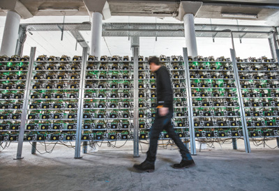 | 1月19日,奧地利伊布斯河畔魏德霍芬附近,一名“礦工”從加密幣“采礦”機組前經過。 |