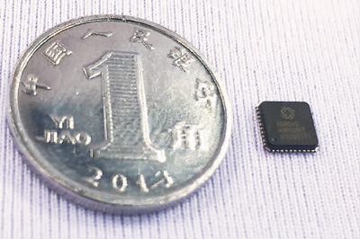 | 2017年9月16日,全球首個支持新一代北斗三號信號體制的高精度導航定位芯片正式發布。圖為支持新一代北斗三號信號體制的高精度導航定位芯片與1角硬幣的對比照片。 |