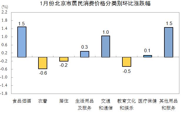 1月份,北京市居民消費價格總水平環比上漲0.4%。其中,食品價格上漲2.0%,非食品價格上漲0.1%;消費品價格上漲0.6%,服務價格上漲0.1%。