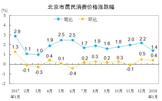 人民網北京2月13日電 據北京市統計局網站消息,國家統計局北京調查總隊、北京市統計局日前公布2018年1月份北京市居民消費價格變動情況。2018年1月份,北京市居民消費價格總水平同比上漲1.4%。其中,食品價格下降1.5%,非食品價格上漲2.0%;消費品價格下降0.2%,服務價格上漲3.7%。