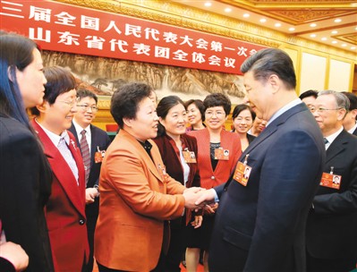 | 3月8日,中共中央總書記、國(guó)家主席、中央軍委主席習(xí)近平參加十三屆全國(guó)人大一次會(huì)議山東代表團(tuán)的審議。在“三八”國(guó)際勞動(dòng)?jì)D女節(jié)到來(lái)之際,習(xí)近平代表黨中央,向參加全國(guó)兩會(huì)的女代表、女委員、女工作人員,向全國(guó)各族各界婦女同胞,致以節(jié)日的祝賀和誠(chéng)摯的祝福。圖為習(xí)近平同女代表親切交談。 |