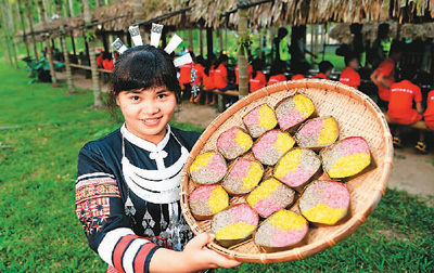 旅游扶貧使海南貧困黎鄉——小妹村脫貧致富。圖為小妹村的一名黎族姑娘展示黎族特色食品——三色飯。DjK安康新聞網