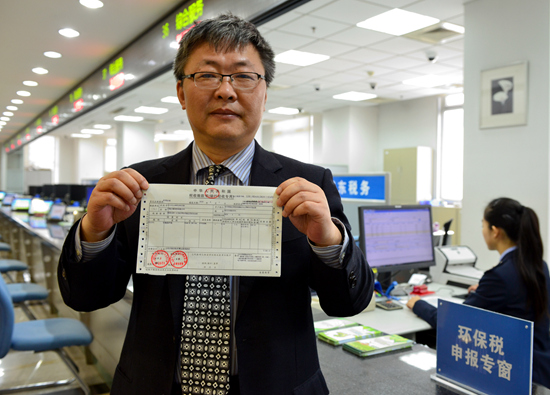當(dāng)天上午,巴斯夫新材料有限公司財(cái)務(wù)人員從上海浦東新區(qū)稅務(wù)局工作人員手中,接過(guò)上海市開(kāi)出的首張環(huán)境保護(hù)稅發(fā)票,這也是我國(guó)環(huán)境保護(hù)稅首個(gè)征期開(kāi)出的首張發(fā)票。(黃黎明攝)