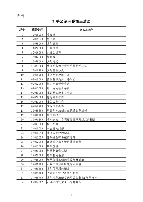 附:對美國加征關(guān)稅商品清單
