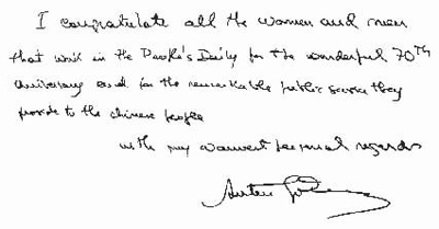 6月15日,人民日報將迎來創刊70周年紀念。當得悉人民日報、人民網、人民日報“兩微兩端”等全媒體平臺超過7億的受眾,將通過文字和視頻分享他的見解時,古特雷斯非常開心,“這是我所見過的最大平臺了”。他欣然為人民日報題詞:“謹向人民日報創刊70周年致以最熱忱的祝賀。感謝貴報全體員工為中國人民提供的卓越服務。”(如圖二)Yy5安康新聞網