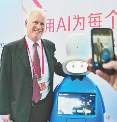 4月9日,清潔能源論壇首席執行官薄銳思在體驗互動后與小i機器人合影。DNx安康新聞網