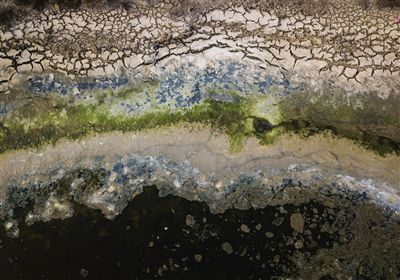 圖為2018年3月30日在江蘇連云港燕尾港鎮化工園區內拍攝的一處水塘,離海一堤之隔的池塘水和岸灘“五顏六色”。記者 李響 攝