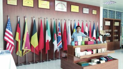 總經理袁利人在產品展示廳介紹海外市場情況。