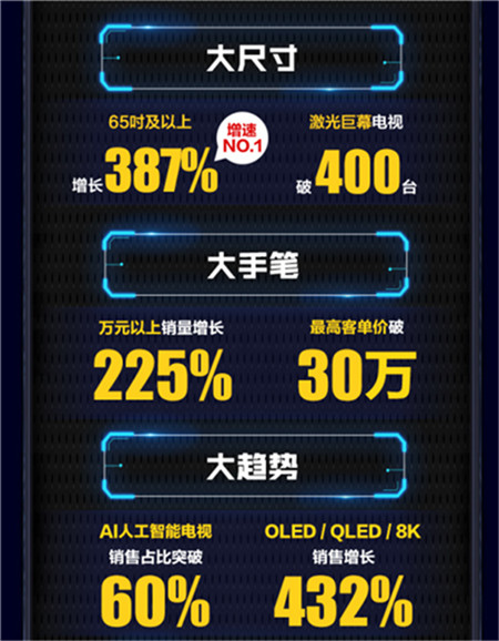 剛剛過去的818,蘇寧家電的主場表現(xiàn)更是引領(lǐng)整體市場的銷售風(fēng)向。65英寸及以上彩電收獲387%的增長,增速行業(yè)第一;大屏新銳激光電視,單天銷售突破400臺;萬元以上高端機(jī)型,銷量增長225%;作為新顯示技術(shù)代表的OLED、QLED、8K電視,銷售增長432%;AI人工智能電視銷售占比突破60%。
