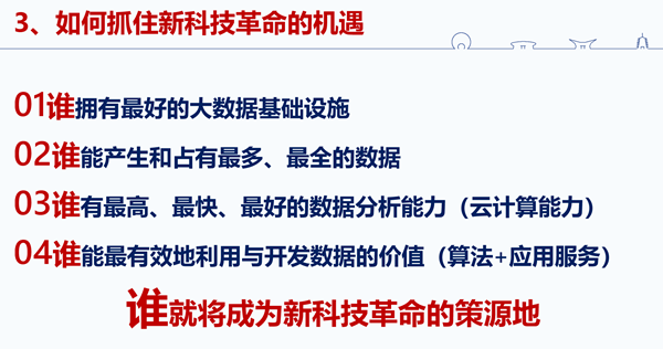 這一次新的科技革命,誰成為它的策源地,誰就會成為科技強國,這個也是十九大習近平總書記給我們提出的要求,到2050年中國要成為科技強國。要想成為科技策源地主要的競爭將會在四個層面展開:第一,誰擁有最好的大數據基礎設施;第二,誰能產生和占有最多、最全的數據;第三,誰有最高、最快、最好的數據分析能力;第四,誰能最有效地利用與開發數據的價值,假如在這四個層面我們全可以領先世界,我們就是新的科技革命的策源地。