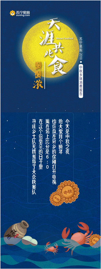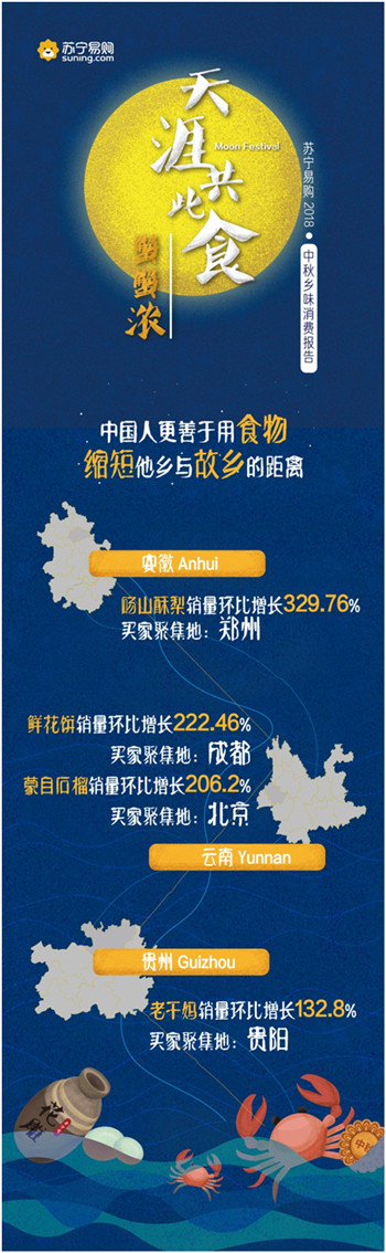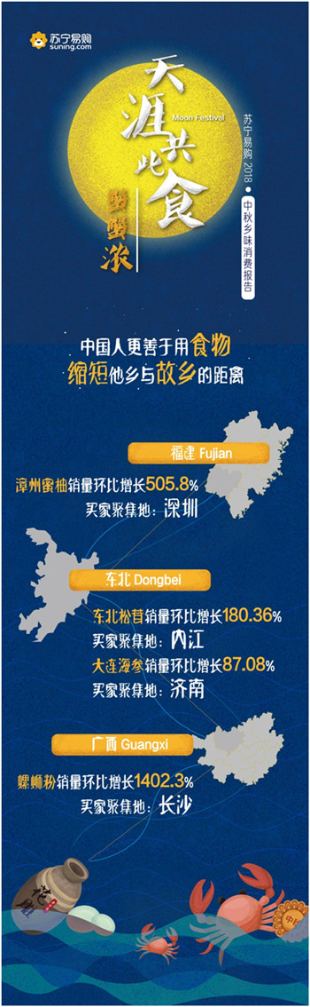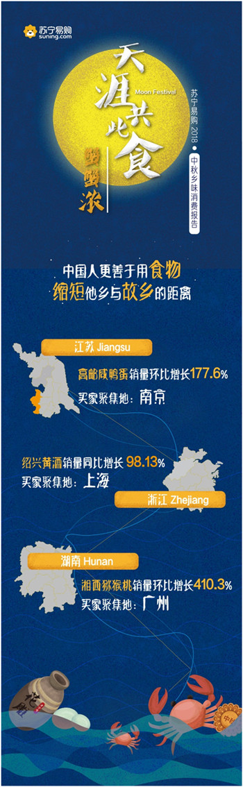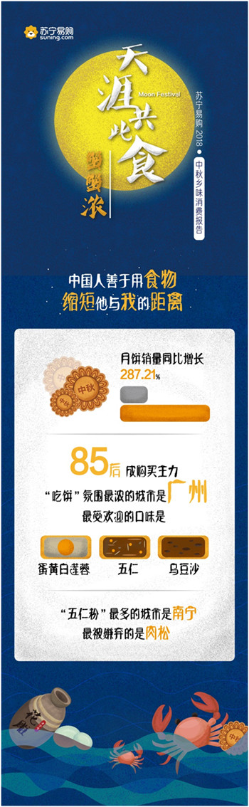 9月23日,蘇寧易購發布了“天涯共此食·中秋鄉味消費報告”。報告顯示,中秋節期間蘇寧易購月餅銷量同比增長287.21%,五仁月餅一改以往被“嫌棄”的形象,成為最受歡迎的口味之一;大閘蟹銷量同比增長1821%,4兩公蟹與3兩母蟹的組合賣得最好,南京一舉成為“最敢吃螃蟹”的城市。