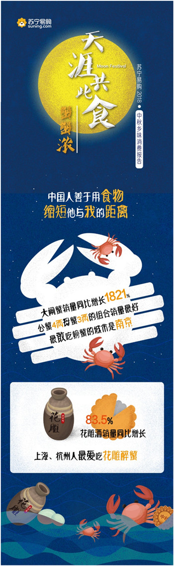 如今,大閘蟹已經成為人們中秋餐桌上的標配。今年4月,蘇寧生鮮與陽澄湖大閘蟹協會展開戰略合作,蘇寧線上自營的大閘蟹全部都來自陽澄湖。9月以來,蘇寧易購大閘蟹的銷量同比增長為1821%,南京、上海、北京、廣州、沈陽成為“最敢吃螃蟹”的城市,4兩公蟹3兩母蟹的組合最受消費者歡迎。此外,蘇寧易購花雕酒的銷量也同比增長83.5%,數據顯示,上海和杭州人最愛吃花雕醉蟹。
