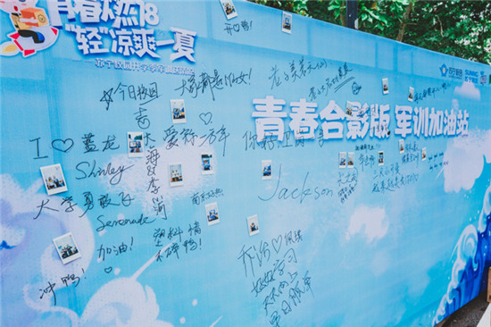 據介紹,本次蘇寧軍訓送清涼活動南農站現場,還特別設置了“青春合影版 軍訓加友站“活動,為軍訓新生們紀念軍訓的英姿。現場所有領取了清涼禮包的同學,可以與身邊好友一起,使用蘇寧校園提供的拍立得合照并將照片貼上展板。