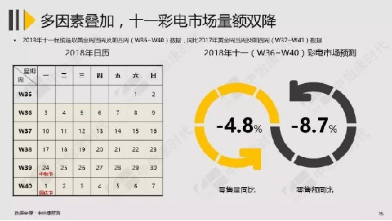 中怡康預測,今年十一彩電市場或呈現“量額雙降”局面,其中零售量同比下降4.8%,零售額則同比下降8.7%,長假對彩電行業所起的作用將小于預期。分析原因主要有兩點:一是每年促銷節點太多,消費者應接不暇;二是新興營銷模式層出不窮,造成消費分流。