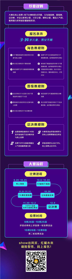 每個孩子都有一個舞臺的夢想,每個孩子的夢想都值得被尊重。無論是一首小小的兒歌,還是一段簡單的舞蹈,抑或一場自信的走秀,都是孩子們極具天賦的才藝。如果你是一位尊重孩子天性發展的家長,如果你希望TA能在國際舞臺上一展風采,那么,別猶豫,舞臺已就位,敢show敢紅,C位星萌娃未來可期!