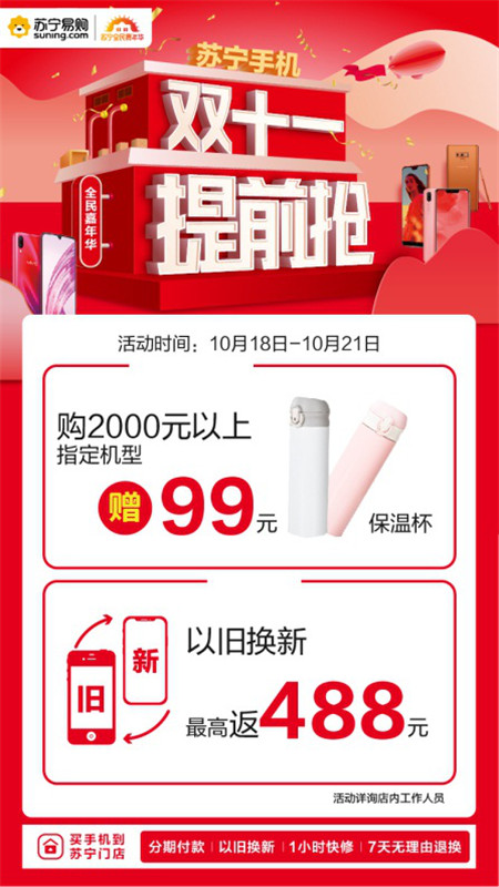本次蘇寧手機(jī)“雙十一提前搶”活動,主要針對以舊換新業(yè)務(wù),活動期間在蘇寧易購門店通過以舊換新購買新機(jī),最高可返488元,同時(shí)購買2000元以上的指定機(jī)型,還可獲得獲贈保溫杯等各種禮品。amq安康新聞網(wǎng)