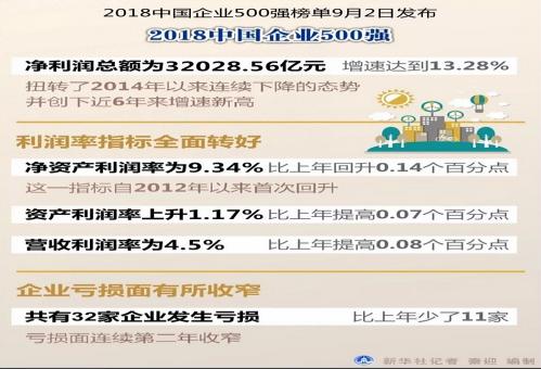 新華社西安9月2日電(記者許晟 張駿賀)2018中國企業(yè)500強(qiáng)榜單2日在西安發(fā)布,500強(qiáng)企業(yè)凈利潤總額為32028.56億元,增速達(dá)到13.28%,扭轉(zhuǎn)了2014年以來連續(xù)下降的……