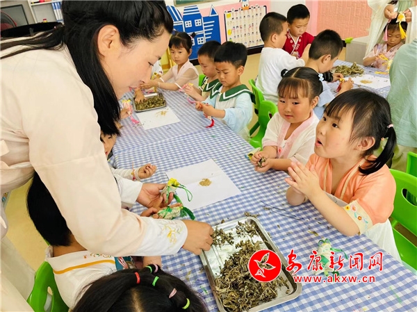 活動前,老師們精心準備了主題教育,通過視頻、兒歌教學、師幼互動等形式一起追溯端午節的由來,講述屈原的愛國故事,了解端午節吃粽子、賽龍舟、掛艾草、做香包等習俗。活動正式開始,只見老師和孩子們身著漢服,仿佛回歸漢唐。孩子踩著一條由艾草鋪成的道路,老師依次為小朋友系“五彩繩”、雄黃“畫額”、“沐蘭湯”凈手,寓意驅邪避蟲,祝福孩子平安健康。儀式結束后,孩子們在院內品嘗了各式香粽、大蒜、雞蛋和水果。隨后又在班級制作了端午吉祥物——香包,并相互佩戴。最后,大家齊聚院內,開展了“賽龍舟”、投壺、射五毒等端午傳統游戲活動。