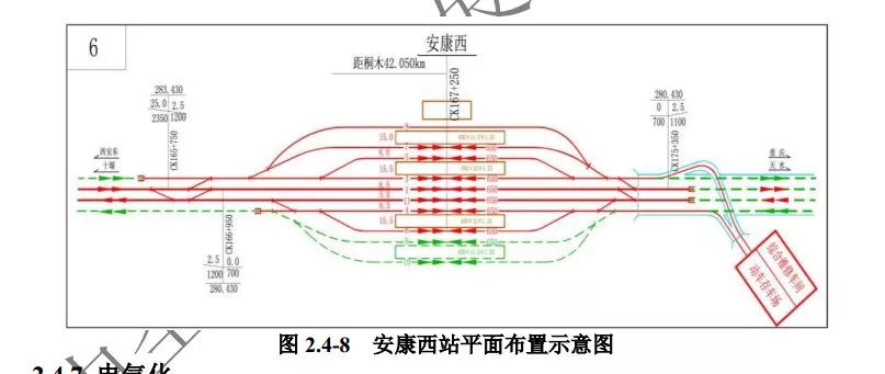 車站初始規3臺8線布置,遠期隨天水一十堰鐵路引入預留1臺2線(PS:另一條高鐵過境安康,美),總規模4臺10線。到發線有效長650m,設島式站臺(450×12×1.25m)4座,設旅客進出站地道2座(寬12m)。