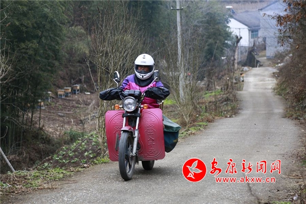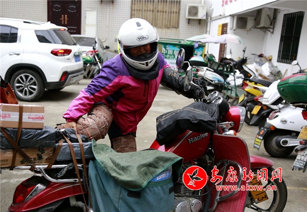 新春之際,陜南天氣依然寒冷。趙明翠戴上頭盔,捆綁好厚厚的護膝,艱難得跨上摩托車,點火起步出發,開始了一天的投遞工作。記者驅車緊跟隨其后,在很多拐彎和上下坡路段,我們看到趙明翠為了平衡摩托車,經常是兩腳尖著地。