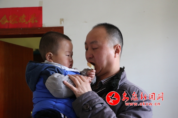 胡珂的小兒子赫赫沒人看管,只能寄放在鄰村的保姆家,周末胡珂來接孩子回安康和妻子、大兒子團聚。記者 陳俊 攝
