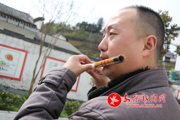 2017年,村上給胡珂和楊先彩在學校協調了兩間房子作為他們的宿舍,閑暇時胡珂會拿起心愛的笛子在學校的操場上演奏一曲,悠揚的笛聲回蕩在村子的上空,其中也寄托著胡珂對妻兒的想念。實習記者 滕靜 攝