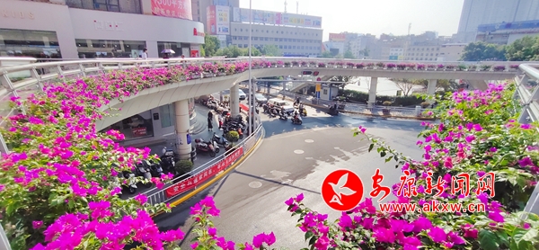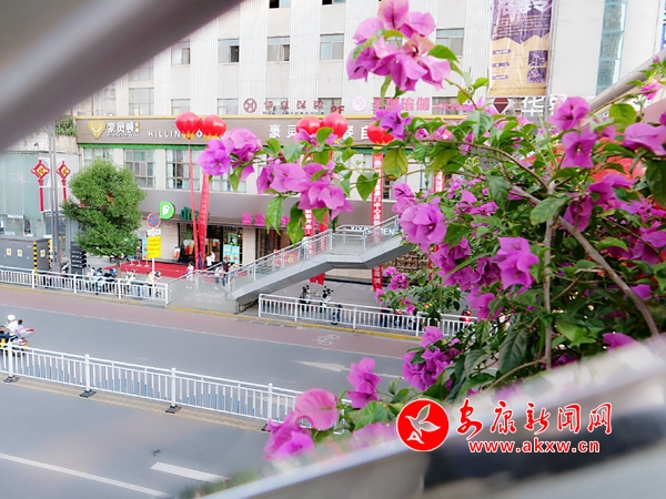 本網訊 (記者 艾蓓)日前,記者途徑安康城區各大人行天橋時發現,一抹鮮艷的色彩映入眼簾,遠遠地就看到一簇簇三角梅沿著天橋欄桿一字排開,玫紅色的花朵在綠葉的映襯下更顯絢麗。原本“呆板乏味”的人行天橋在鮮花的裝扮下,變得姿態萬千,生氣十足,人在橋上行走,仿佛在花廊中穿行,讓人心曠神怡。
