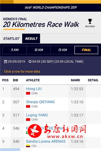 本報訊(記者 魏濤 通訊員 章理)9月30日,在2019年多哈田徑世錦賽女子20公里競走決賽中,中國隊包攬前三名。現世界紀錄保持者劉虹以1小時32分53秒獲得冠軍;名將切陽什姐獲得亞軍,安康籍運動員楊柳靜以1小時33分17秒獲得季軍,這是中國田徑隊歷史上第一次在世錦賽單項目上包攬前三。