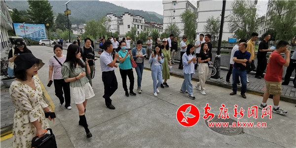 在饒峰鎮勝利村,采訪團圍著村支書楊衛東,聽他講述勝利村是如何從“后進村”變成現在產業興、旅游旺的新村故事。勝利村村民借助饒峰驛站這個扶貧基地實現了增收,而饒峰驛站也給周圍村子帶來了發展機遇。毗鄰的村發展起了民宿經濟,建成30余家農家樂和民宿,還開了5家小商店。光明日報記者王遠方說,“這幾日采訪的過程中我感到,幸福感畫在老百姓的臉上,體現在他們言談舉止中”。
