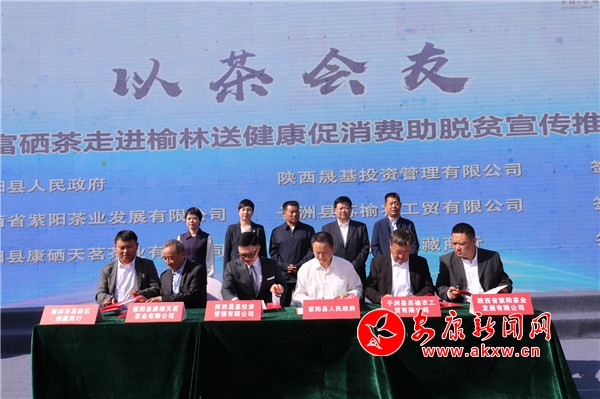 活動儀式上,國家一級茶葉審評技師、陜西省茶人聯誼會會長韓星海對安康紫陽富硒茶作專業點評,紫陽縣有關部門負責人作紫陽招商推介、紫陽富硒茶推介、紫陽旅游推介。活動進行了簽約、紫陽富硒茶專家點評和“紫陽富硒特產營銷中心”授牌儀式。紫陽縣人民政府與陜西晟基投資管理有限公司簽訂富硒礦泉水綜合開發項目;陜西省紫陽茶業發展有限公司與子洲縣蘇榆農工貿有限公司簽訂“紫陽富硒茶、子州”養生茶項目合作開發協議;紫陽縣康硒天茗茶業有限公司與榆林市高新區惟藏商行簽訂紫陽富硒茶購銷協議;紫陽縣供銷聯社與陜西煤山煤海有限公司簽訂共建“榆林市紫陽富硒特產營銷中心”協議,紫陽縣供銷聯社與榆陽區供銷聯社簽訂“地方特產供銷互促合作協議”。EnR安康新聞網
