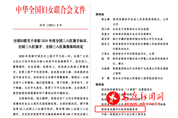 本網訊(通訊員 李倩)“三八”國際勞動婦女節前夕,全國婦聯表彰了一批全國三八紅旗手標兵、全國三八紅旗手和三八紅旗集體。安康市行政審批服務局榜上有名,作為全省六個、全市唯一的單位,榮獲“全國三八紅旗集體”榮譽稱號。