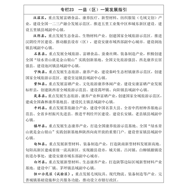 構(gòu)建“一核、兩心、兩帶、多點(diǎn)”新型城鎮(zhèn)化格局。一核:以中心城市為核心,推動(dòng)瀛湖生態(tài)旅游區(qū)、恒口示范區(qū)(試驗(yàn)區(qū))融入中心城市發(fā)展。兩心:推進(jìn)漢陰、旬陽市域副中心城市建設(shè)。兩帶:月河川道城鎮(zhèn)帶,統(tǒng)籌中心城市—恒口—漢陰—石泉協(xié)同發(fā)展,建設(shè)城鄉(xiāng)統(tǒng)籌示范區(qū)、新型工業(yè)聚集區(qū)、綠色發(fā)展引領(lǐng)區(qū)。漢江生態(tài)城鎮(zhèn)帶,以漢濱、石泉、旬陽為核心,漢陰、紫陽、嵐皋、白河為節(jié)點(diǎn),輻射帶動(dòng)其他區(qū)域,打造三產(chǎn)融合發(fā)展的漢江生態(tài)城鎮(zhèn)帶。多點(diǎn):以其他縣城、重點(diǎn)鎮(zhèn)、縣域工業(yè)集中區(qū)、現(xiàn)代農(nóng)業(yè)園區(qū)和旅游景區(qū)為節(jié)點(diǎn),打造縣域經(jīng)濟(jì)增長極。