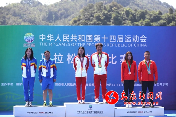 隨后舉行了頒獎儀式,十四運會馬拉松游泳項目競委會副主任、國家體育總局游泳運動管理中心副書記李軍,十四運會馬拉松游泳項目競委會副主任、安康市政府副秘書長劉福全,分別為奪得第一、二、三名的運動員頒發(fā)獎牌,送上賽事吉祥物。