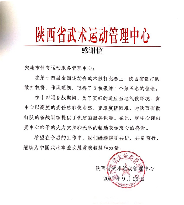 第十四屆全國運(yùn)動(dòng)會(huì)武術(shù)散打比賽圓滿結(jié)束,陜西省散打隊(duì)敢打敢拼、作風(fēng)硬朗,取得了2枚銀牌1個(gè)第五名的佳績(jī)。在十四運(yùn)備戰(zhàn)期間,我市克服疫情困難,為陜西省散打隊(duì)的備戰(zhàn)訓(xùn)練提供了優(yōu)質(zhì)的服務(wù)保障,讓隊(duì)員更好地適應(yīng)安康氣侯環(huán)境。感謝信中寫道:“希望在今后的工作中,繼續(xù)攜手共進(jìn),并肩前行,為中國武術(shù)事業(yè)發(fā)展貢獻(xiàn)智慧和力量。”