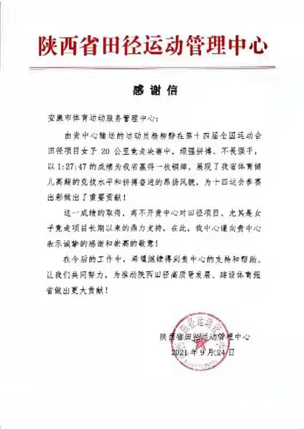 據(jù)了解,由安康市體育中心輸送的安康籍運(yùn)動(dòng)員楊柳靜在第十四屆全運(yùn)會(huì)田徑項(xiàng)目女子競走20公里決賽中為陜西省贏得一枚銅牌。感謝信中寫道:“希望雙方共同努力,為推動(dòng)陜西田徑高質(zhì)量發(fā)展,建設(shè)體育強(qiáng)省做出更大貢獻(xiàn)!”