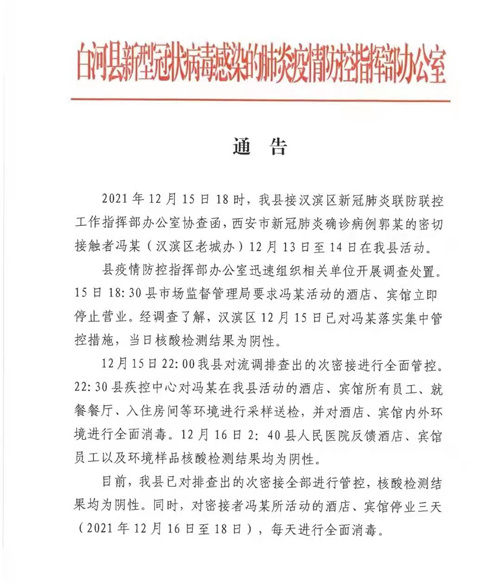 縣疫情防控指揮部辦公室迅速組織相關(guān)單位開展調(diào)查處置。15日18:30縣市場監(jiān)督管理局要求馮某活動的酒店、賓館立即停止?fàn)I業(yè)。經(jīng)調(diào)查了解,漢濱區(qū)12月15日已對馮某落實集中管控措施,當(dāng)目核酸檢測結(jié)果為陰性。