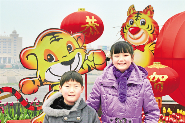 那些年每年春節(jié),相關(guān)單位都會(huì)在安康城區(qū)重要的游玩場所布置生肖的卡通畫像等花燈。這兩個(gè)小朋友也要站在生肖“虎寶寶”前拍照留念(圖五)。預(yù)祝著來年“虎虎生威,虎年大吉……”