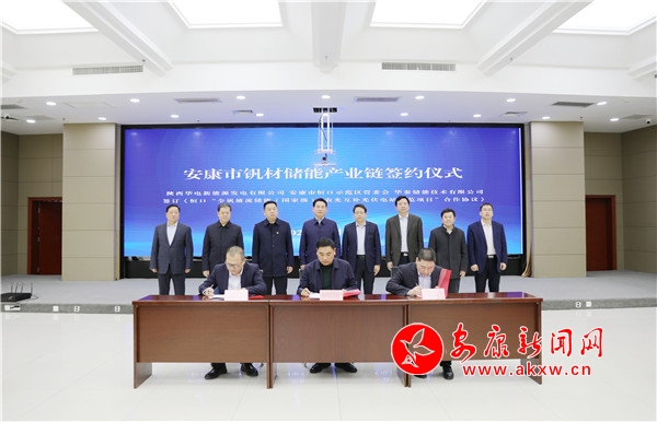 會上,趙俊民還就組建市釩材儲能產業鏈鏈長制工作專班、推動液流儲能示范應用等事宜作了安排部署,對與會人員提出的問題作了一一回應。華電陜西能源有限公司分別與華秦儲能技術有限公司、恒口示范區簽訂了合作協議。