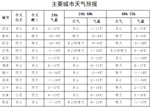 今天晚上:陜北、關中多云轉晴天,陜南陰天轉多云,南部局地有小雨。日平均氣溫陜北黃河沿線、關中中東部下降4℃左右。