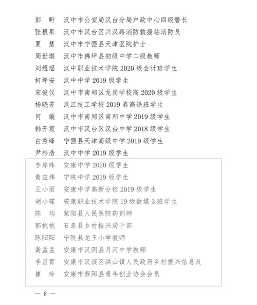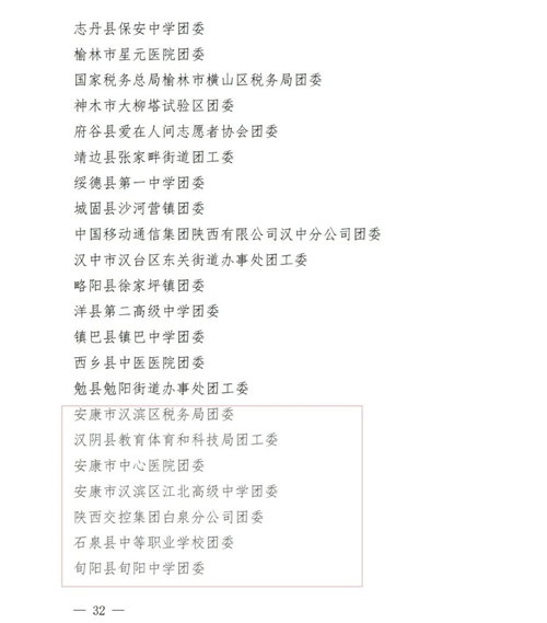 為表彰先進(jìn),激勵(lì)廣大團(tuán)員、團(tuán)干部和基層團(tuán)組織奮發(fā)有為、 再創(chuàng)佳績,共青團(tuán)陜西省委近日表彰了2020-2021 年度“陜西省優(yōu)秀共青團(tuán)員”“陜西省優(yōu)秀共青團(tuán)干部”“陜西省五四紅旗團(tuán)支部”“陜西省五四紅旗團(tuán)委”。我市李岸緯等12名共青團(tuán)員、唐正剛等9名共青團(tuán)干部、安康市審計(jì)局團(tuán)總支等9個(gè)團(tuán)總支(支部)、安康市漢濱區(qū)稅務(wù)局團(tuán)委等7個(gè)團(tuán)委獲得表彰!